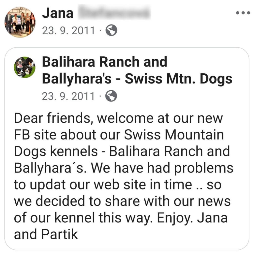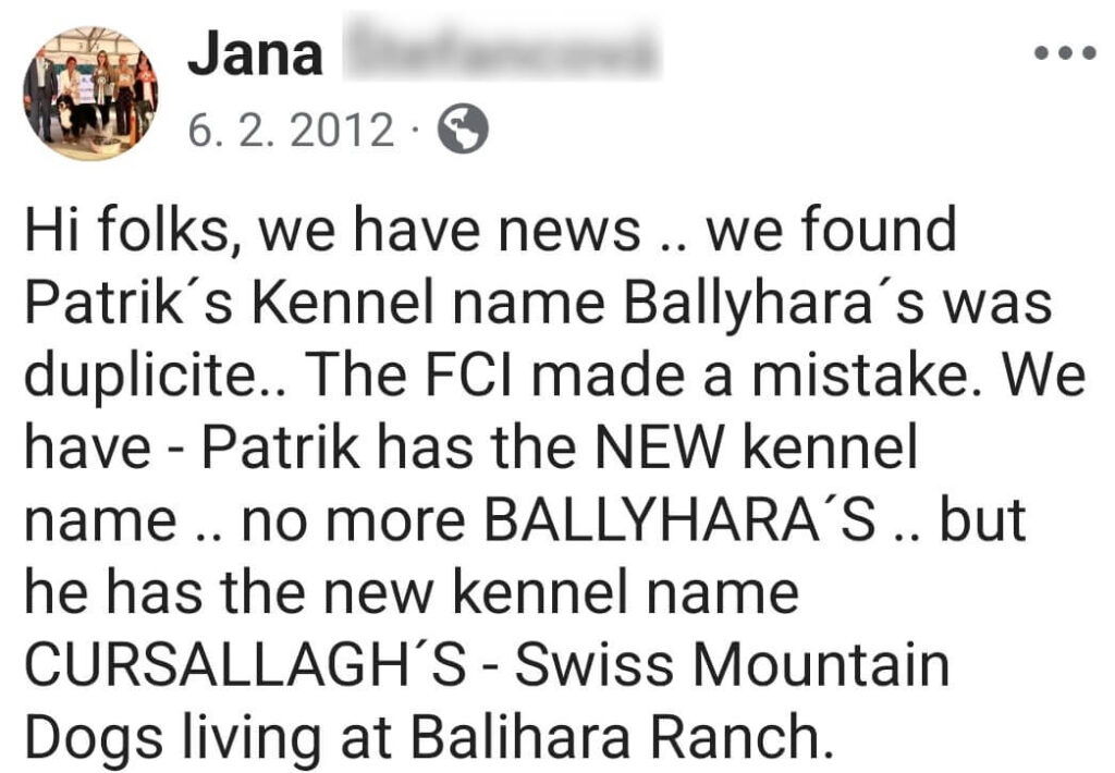 Here she directly linked two kennel names, presenting them together as “our kennels.” - February 2012: “No more Ballyhara’s… but he has the new kennel name Cursallagh’s – Swiss Mountain Dogs living at Balihara Ranch.”